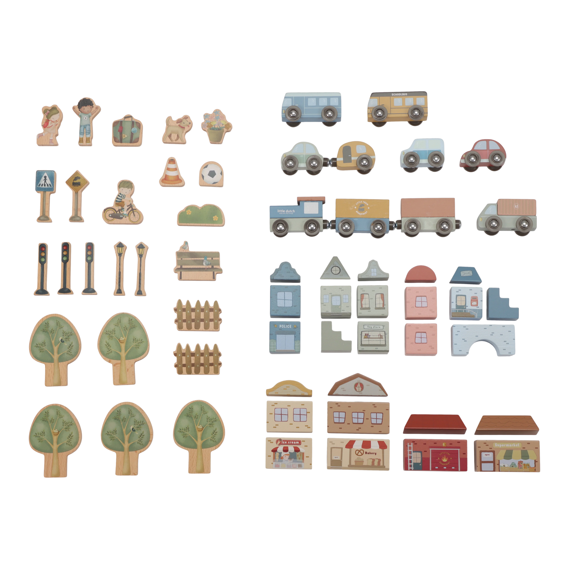 Baue deine eigene Welt mit der Little Dutch Holz-Eisenbahn XL! Dieses umfangreiche Set enthält eine Lokomotive, Waggons, Schienen, Brücken, Gebäude, Autos und Figuren. Es gibt auch Bäume und Verkehrsschilder. Die Möglichkeiten sind endlos! Fahre mit dem Zug über die Brücke, halte am Bahnhof und entdecke die Stadt. Kombiniere die XL-Eisenbahn mit Erweiterungssets, um noch mehr Spielspaß zu erleben. Steigst du ein? 113 Teile.