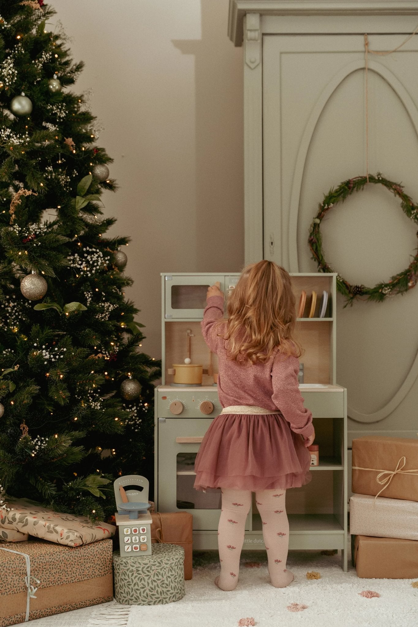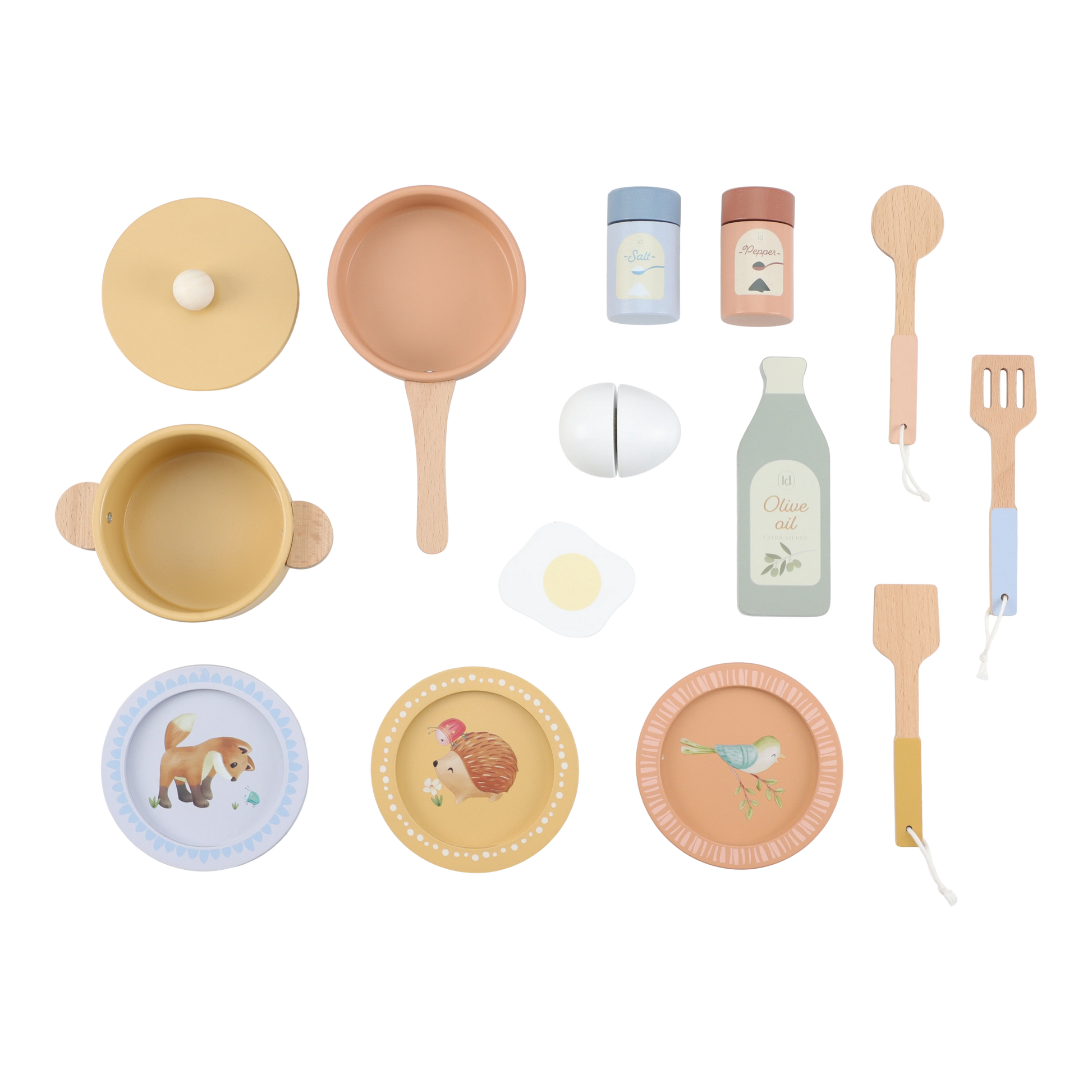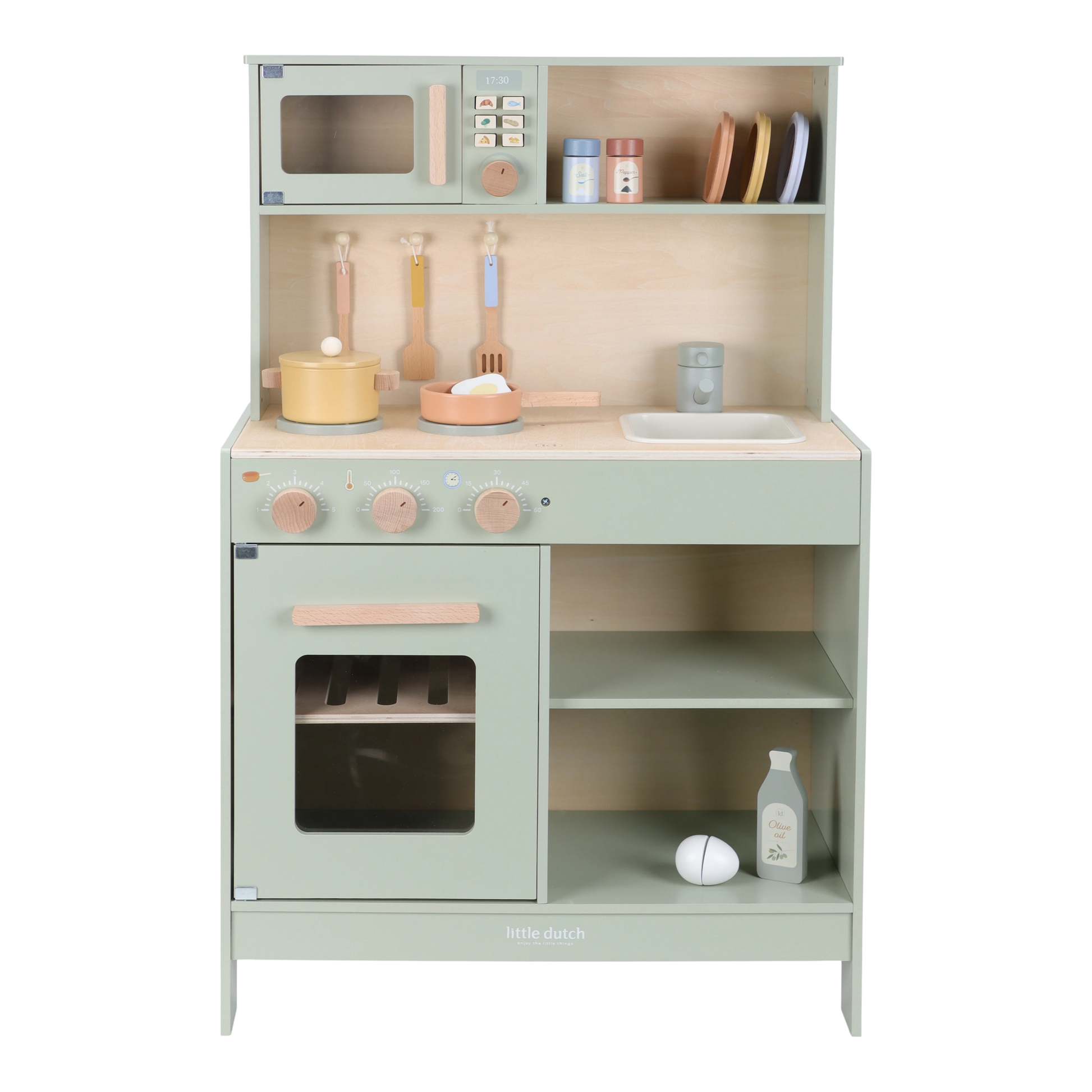 Kleine Köche können in dieser wunderschönen mintfarbenen Holzspielküche loslegen! Backe einen köstlichen Kuchen im Ofen, koche frisches Gemüse auf dem Herd oder brate ein Ei in der Pfanne. Die Küche ist komplett ausgestattet mit zwei Pfannen, Küchenutensilien, drei Tellern und einem Waschbecken zum Händewaschen. Ebenfalls enthalten: eine Flasche Olivenöl, ein Salz- und Pfefferstreuer und ein Schrank, um alle Einkäufe ordentlich zu verstauen. Die Mikrowelle hat echte Knöpfe mit Illustrationen für zusätzlichen Spielspaß. Was wird heute gekocht?