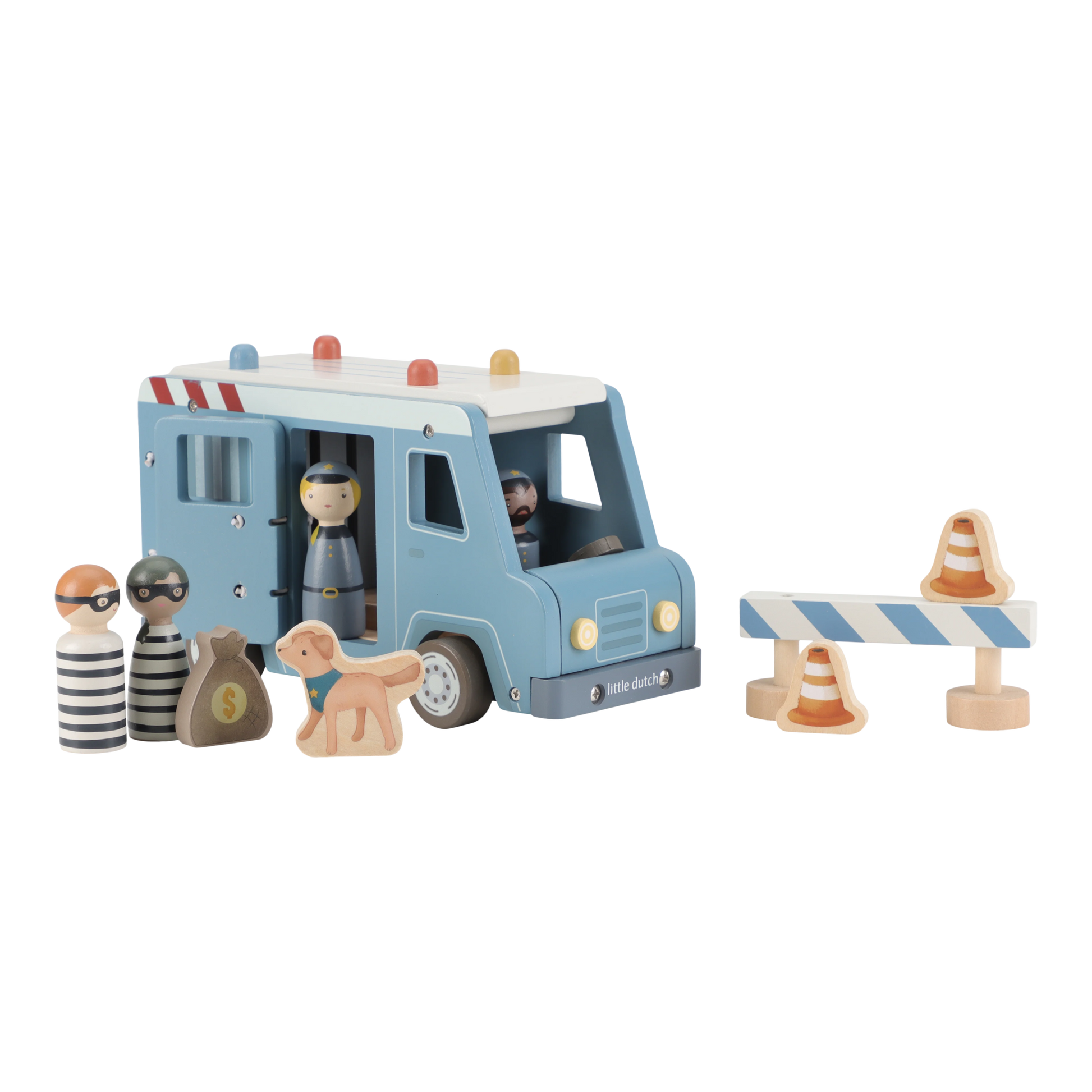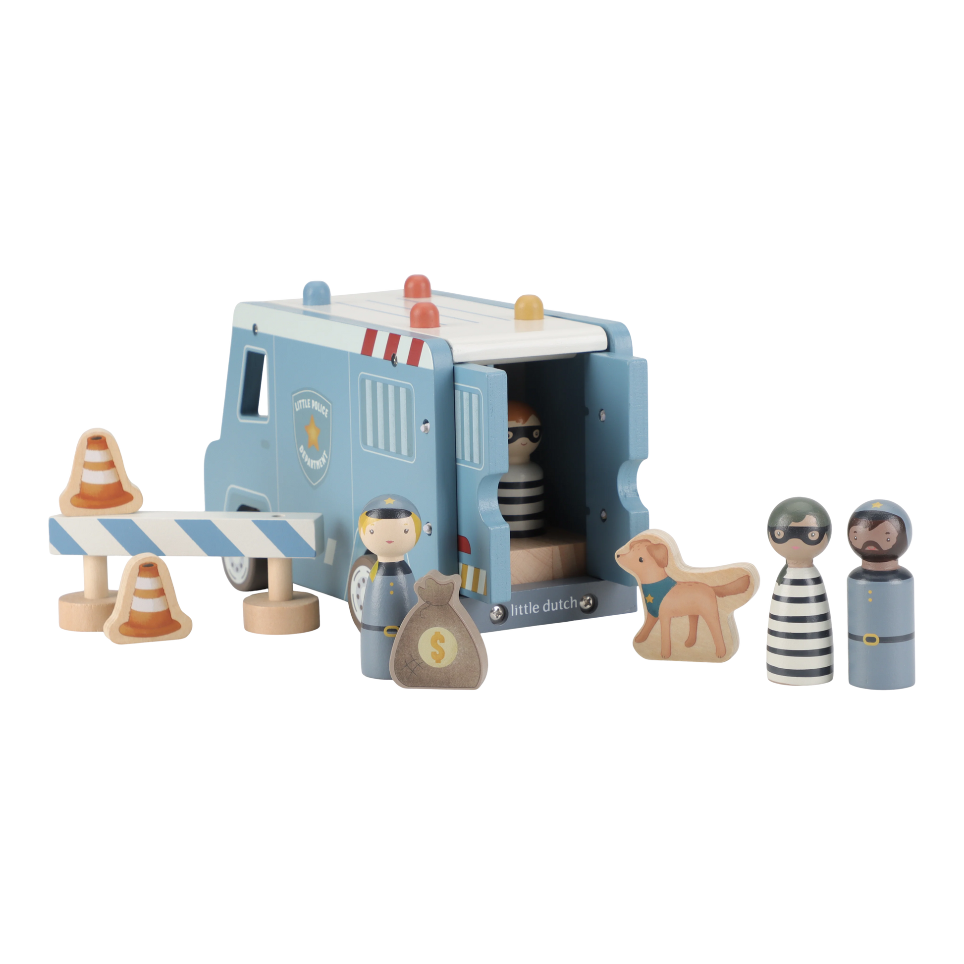 Gauner hinter Gittern! Dieser Holz-Polizeibus enthält vier Figuren (zwei Polizisten und zwei Gauner), einen Polizeihund, einen Geldsack, Pylonen und eine Absperrung. Der Bus hat eine Zelle mit einer klappbaren Tür, damit die Verbrecher sicher transportiert werden können. Erlebe spannende Polizeiabenteuer und halte die Stadt sicher!